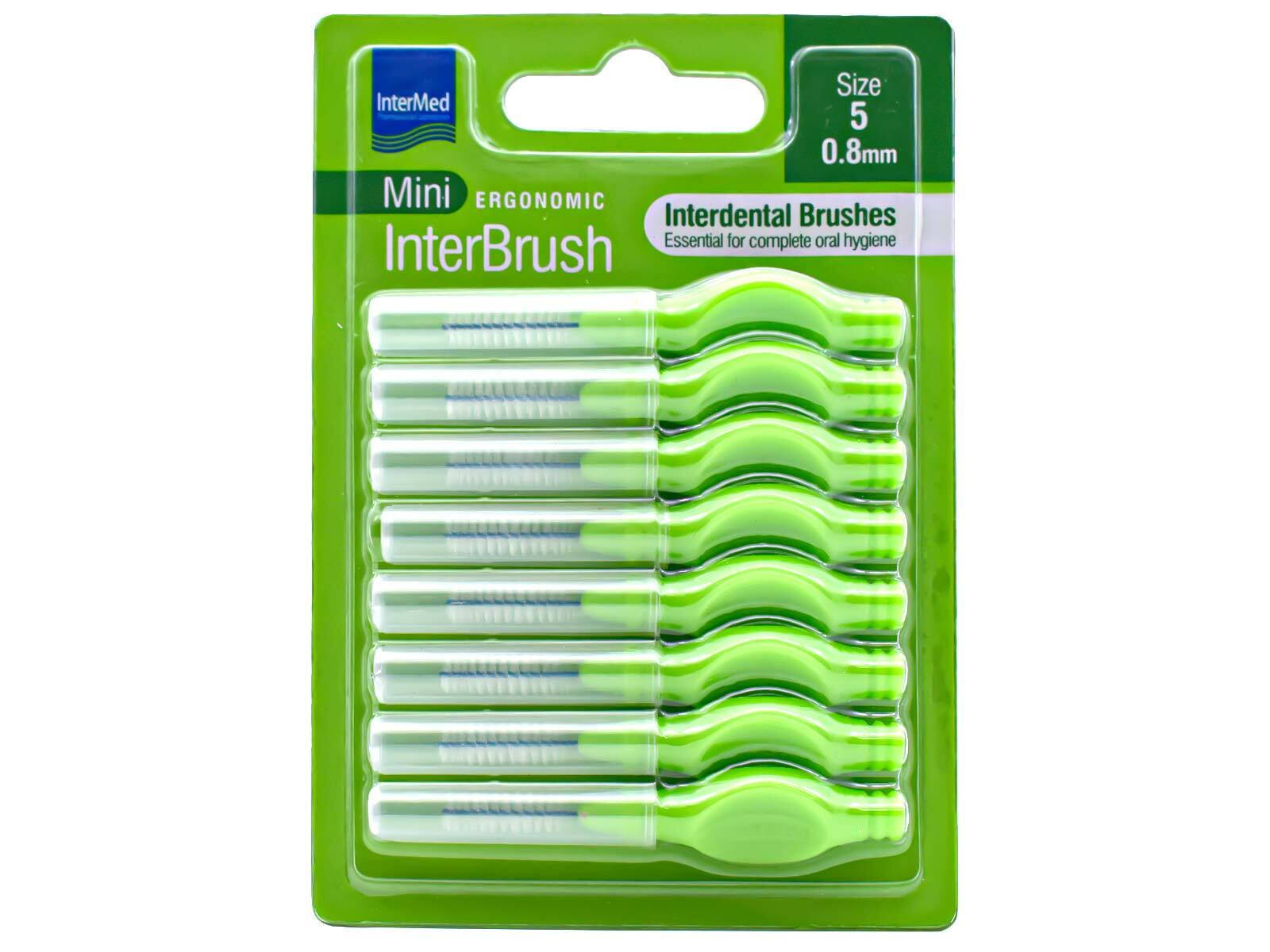 Μεσοδόντια βουρτσάκια της εταιρείας Intermed σε πράσινο χρώμα και προσβασιμότητα 0.8mm, τα οποία είναι σχεδιασμένα ώστε να βοηθούν στον καλύτερο και ευκολότερο καθαρισμό των στενών περιοχών ανάμεσα στα δόντια, εκεί όπου οι απλές οδοντόβουρτσες δεν μπορούν να φτάσουν αποτελεσματικά, ενώ είναι ηπιότερα για τα ούλα απ’ ότι το οδοντικό νήμα. Επιπλέον, διαθέτουν λαβή για μεγαλύτερη εργονομία κατά τη χρήση και ευκολότερη πρόσβαση στα πίσω δόντια.