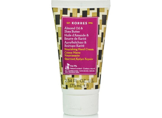 Θρεπτική κρέμα χεριών Korres με Αμύγδαλο & Βούτυρο Καριτέ, ιδανική για ξηρά σκασμένα χέρια, μη λιπαρή.